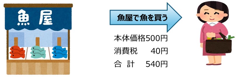 魚屋で本体価格500円の魚を買う場合、消費税8%分の40円が加算され、合計540円を支払うことになります。